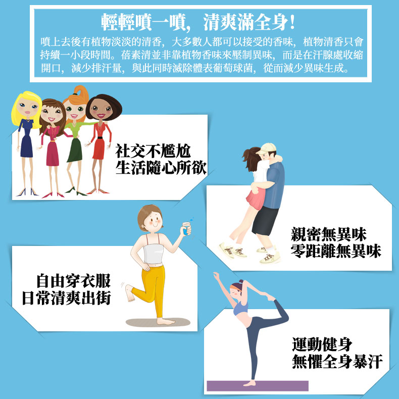 | 多種草本植物提取,有效收斂大汗腺,減少分泌物,消滅葡萄球菌等菌落。止汗消臭,令肌膚清爽舒適,解決異味煩惱。 | |